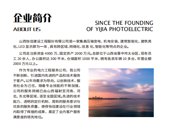 山西怡佳建設(shè)工程股份有限公司是一家集高壓輸變電、機(jī)電安裝、建筑智能化、建筑亮化、LED 顯示屏為一體,具有跨區(qū)域、網(wǎng)絡(luò)化、信息化、智能化等特點(diǎn)的企業(yè)。